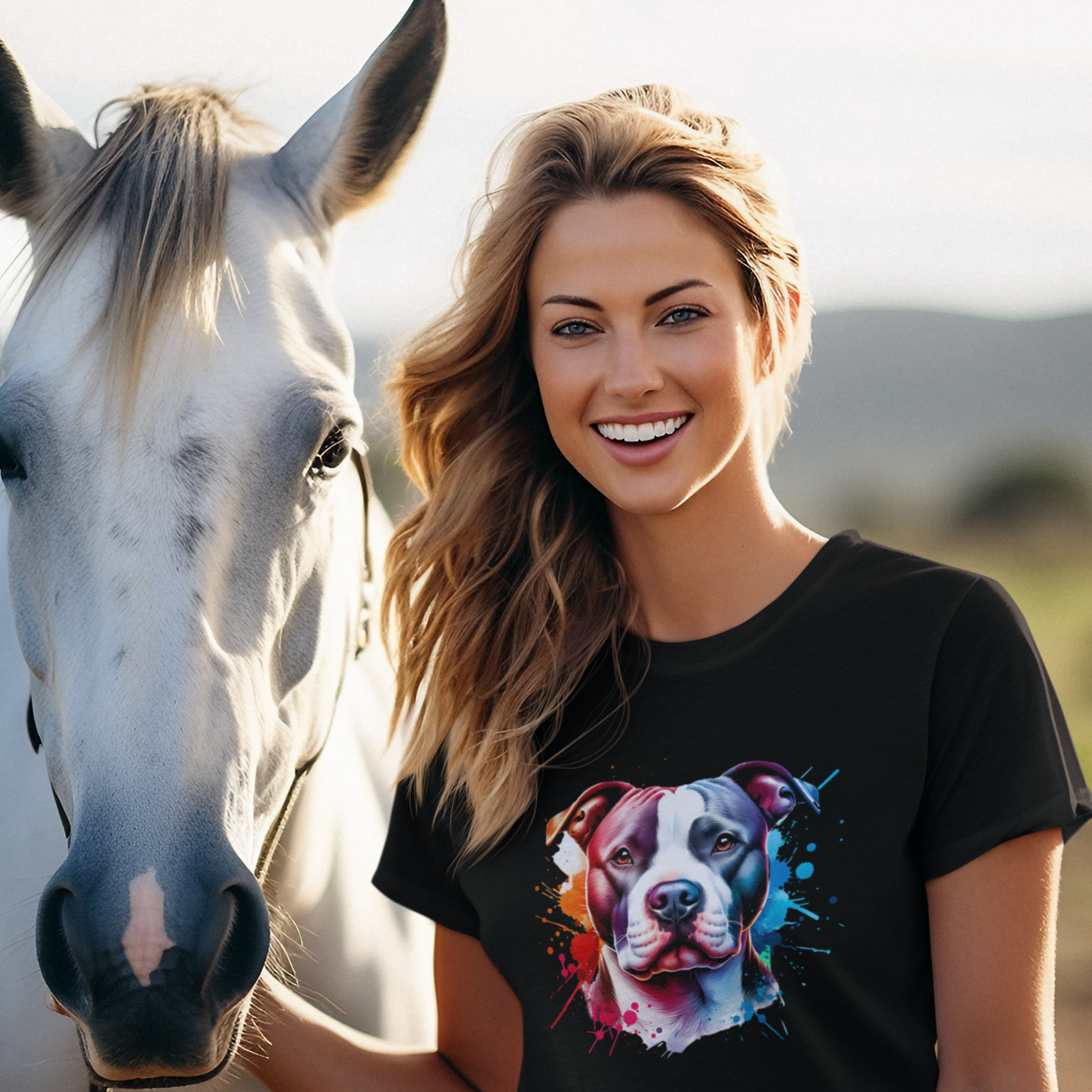 Great for any casual outing, this tee pairs excellently with jeans, shorts, or even a sporty skirt. The unique watercolor design adds a playful and energetic vibe to your look. So, why wait? Show off your love for American Pit Bull in the most spirited way possible!